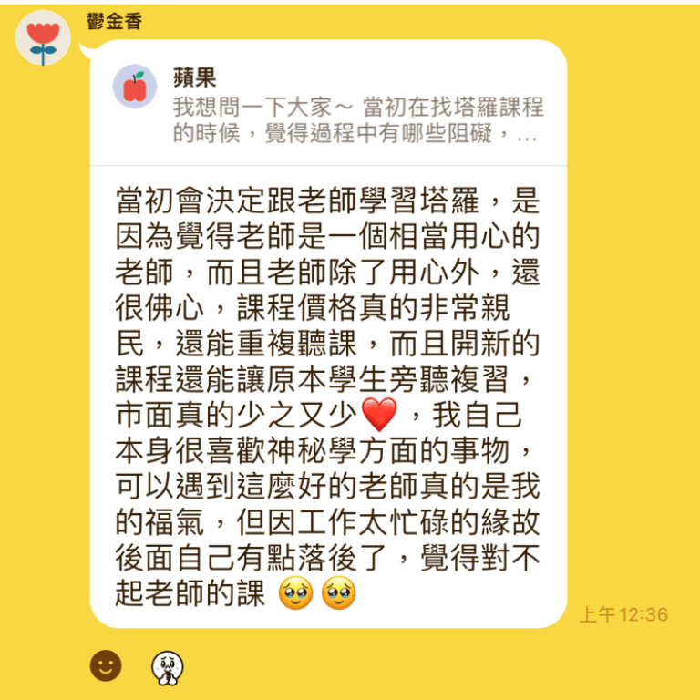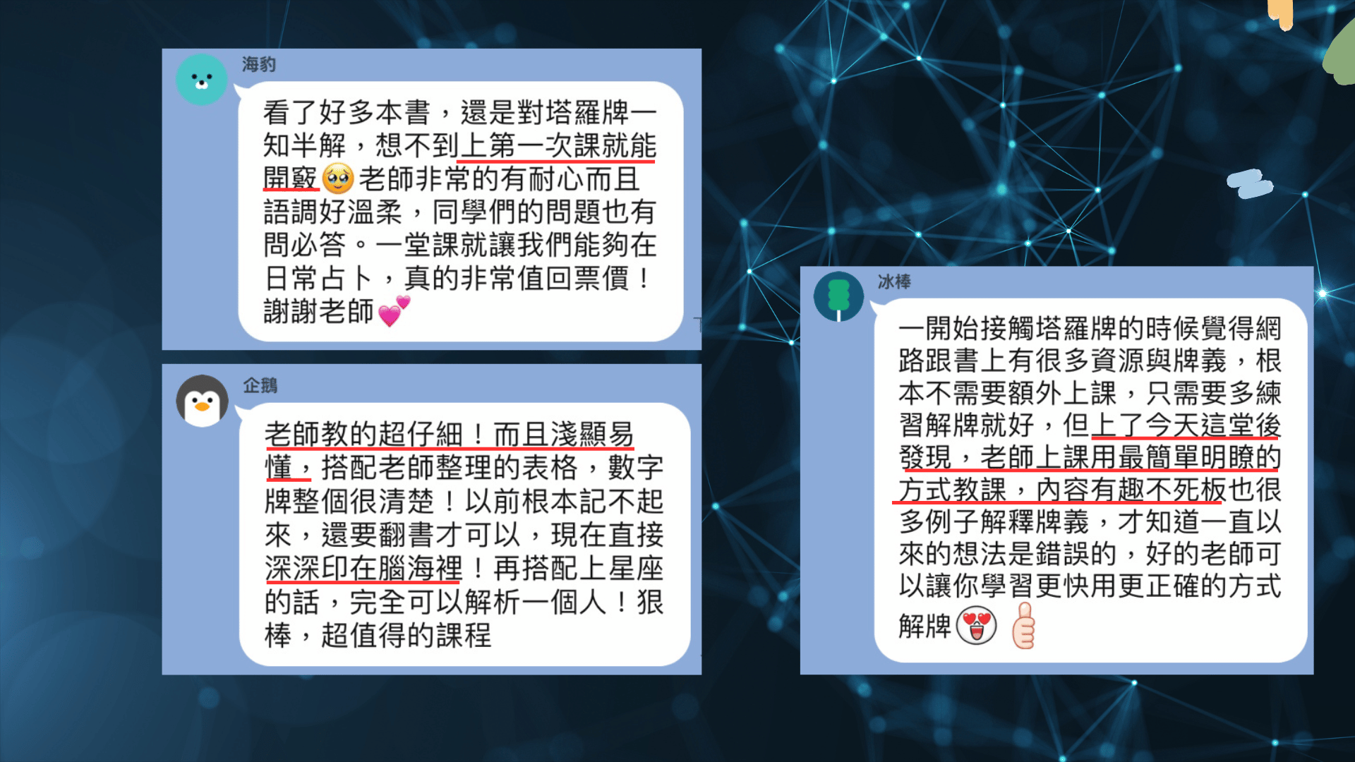 3.課程約30小時且「終身輔導」,老師認為學習塔羅是需要時間的,30小時是教會你技巧跟老師的經驗,但你有自己獨特的「經驗與風格」,需要長時間實戰才能找到,所以我們提供終身輔導讓你與老師、同學們一起成長,實戰過程遇到問題都有靠山可以問。