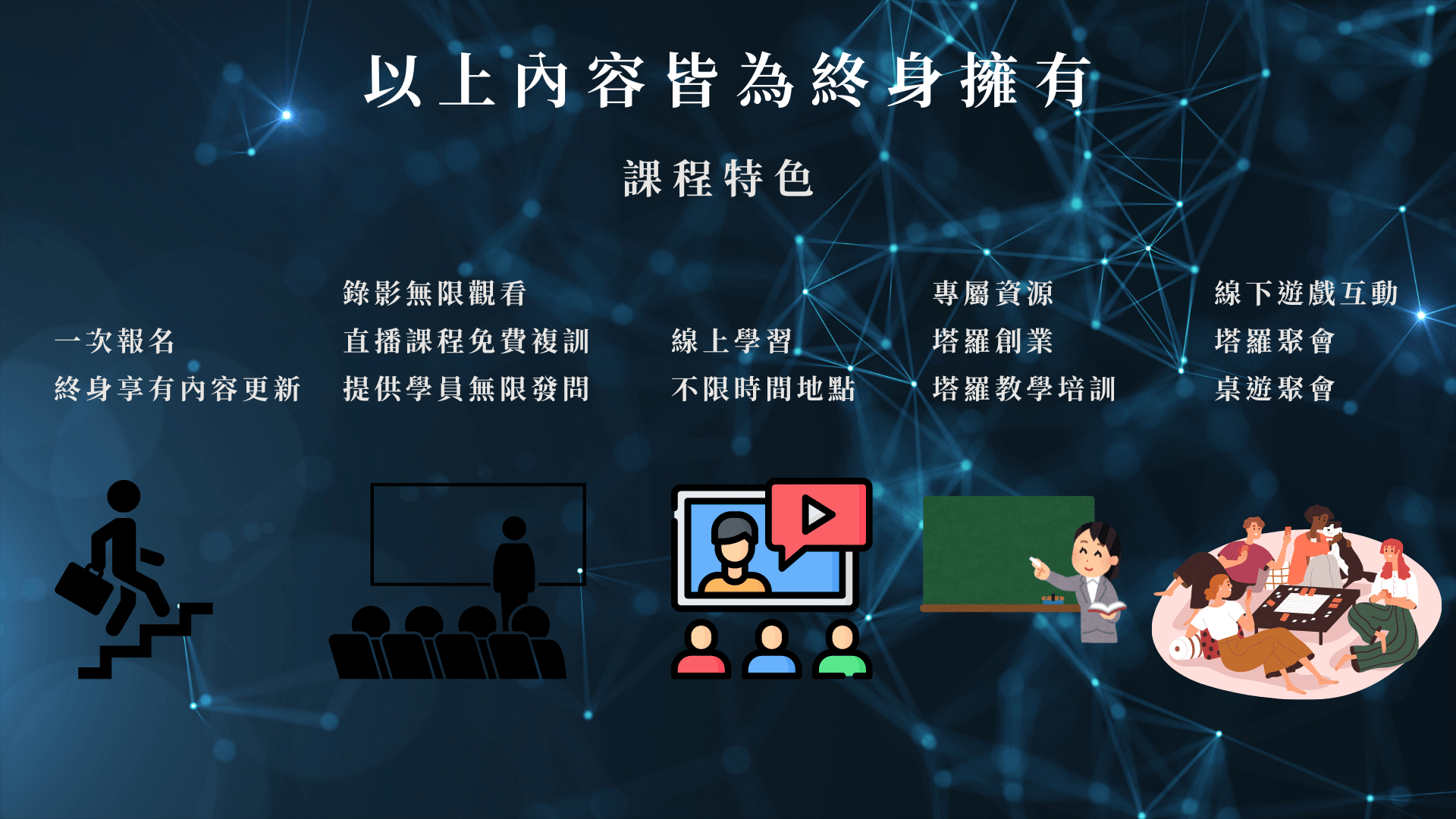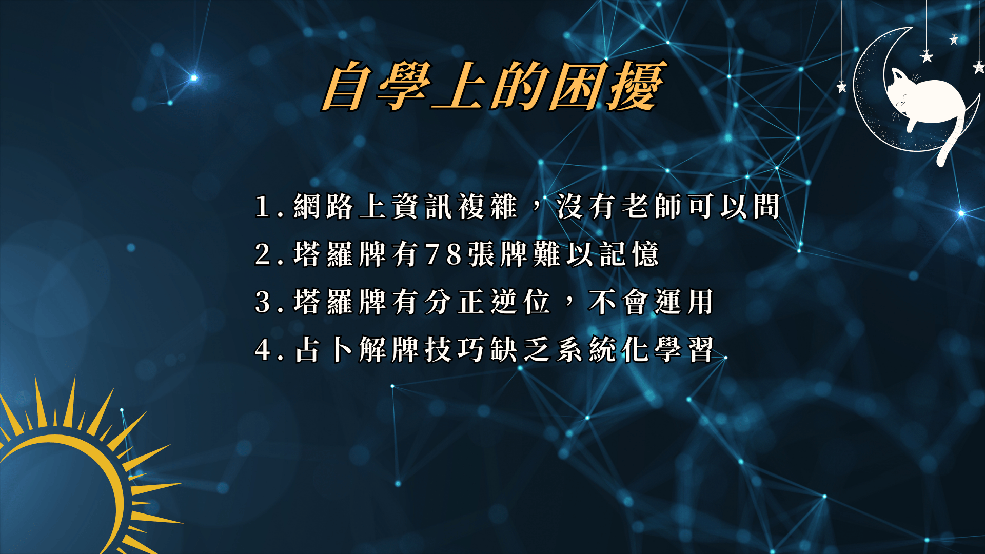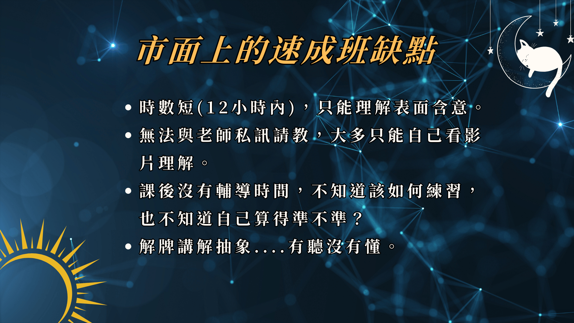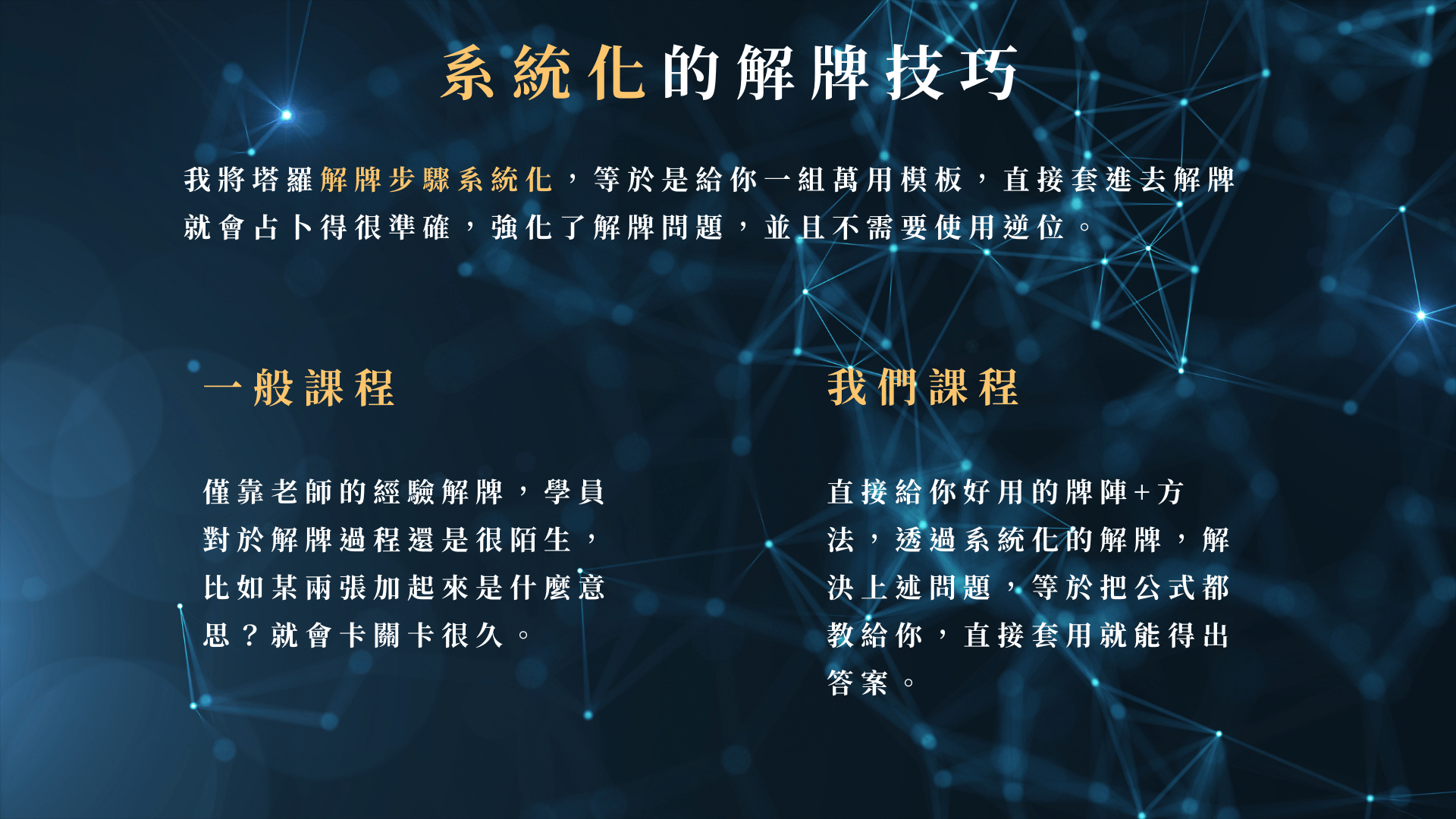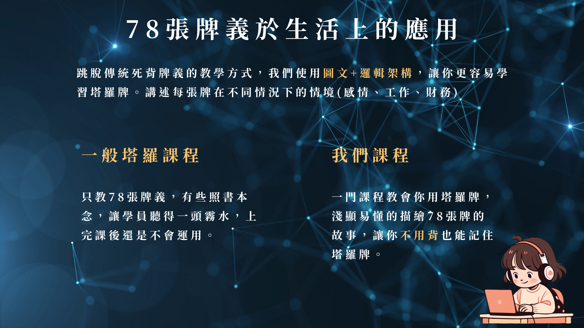 1.跳脫傳統死背牌義的教學方式,我們使用圖文+邏輯架構,學習塔羅牌更加簡單。我們沒有分階上課,而是一門課程就可以學會所有的塔羅牌應用技術。