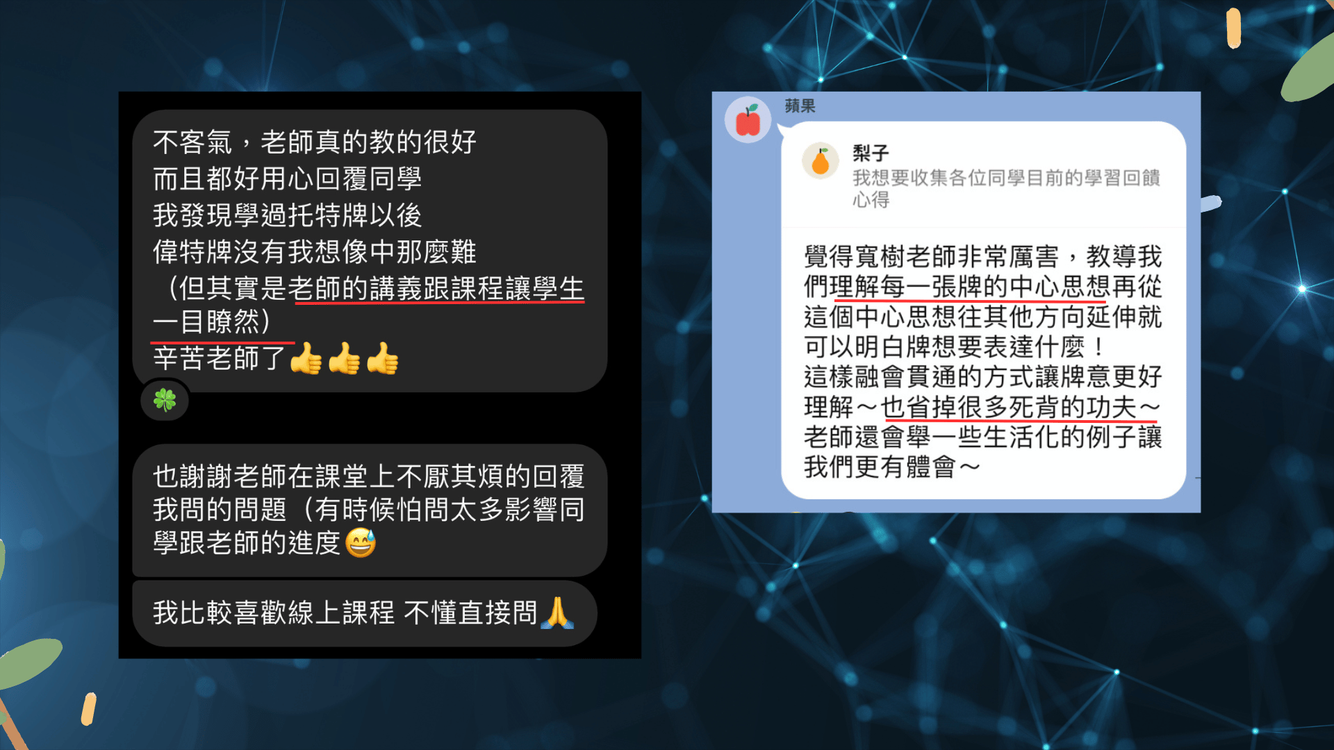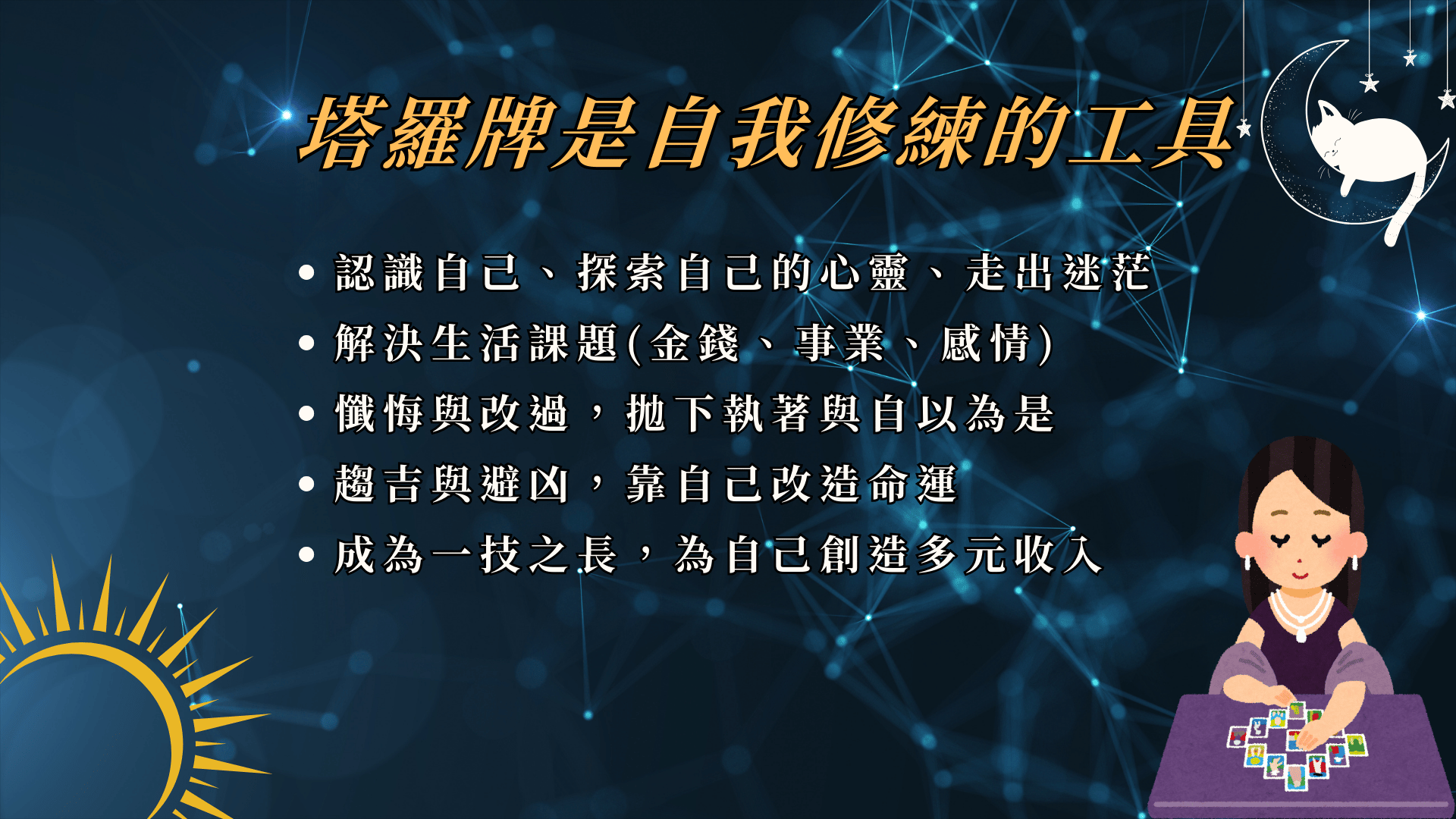 塔羅牌並沒有所謂的標準答案,我相當注重每位學生的「個人成長經驗」,因為這是每個人與生俱來的特質跟天賦,只有發揮得當才能擺脫人生困境,活出自己與理想的生活。