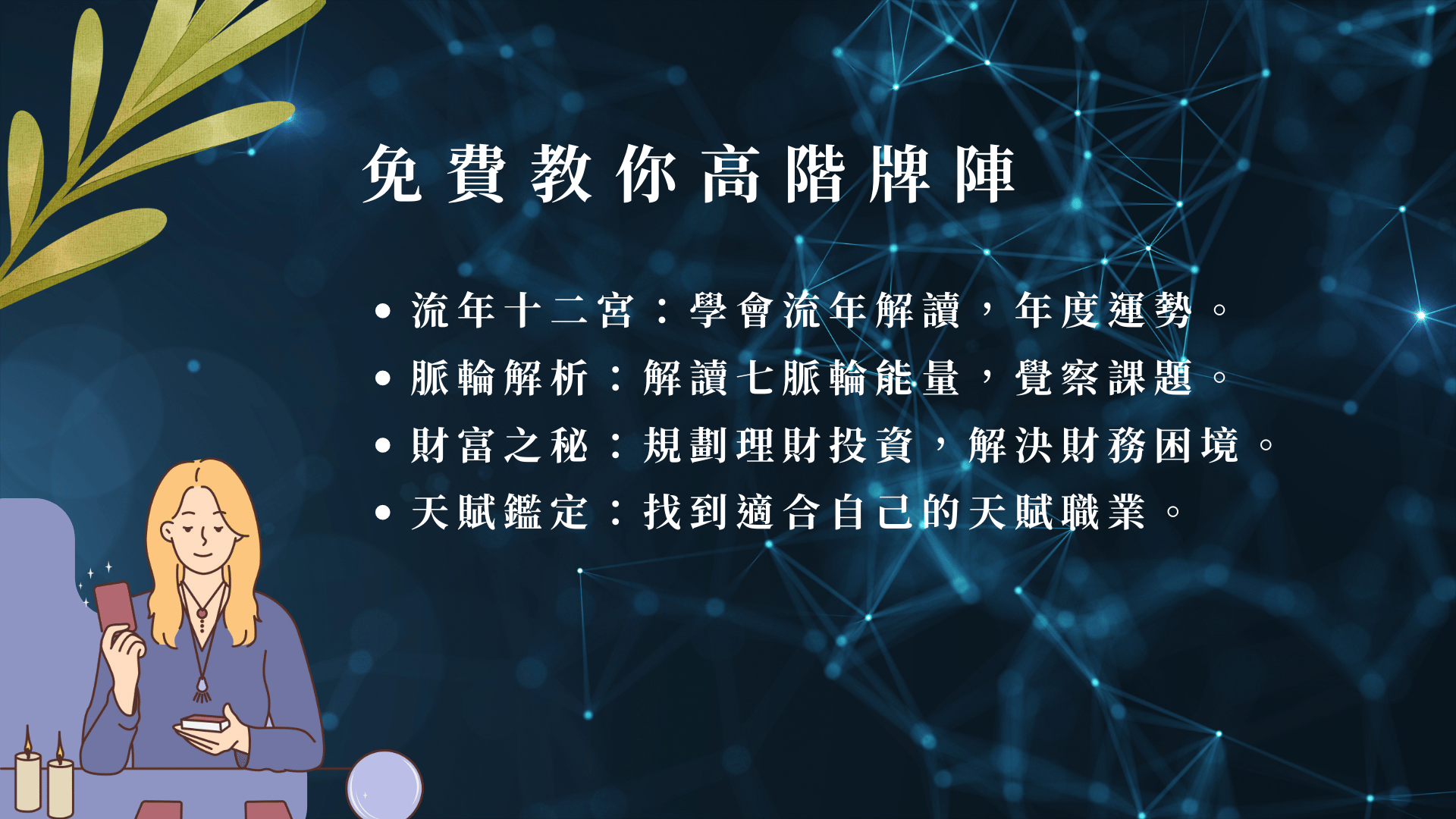 現在報名會再額外贈送流年十二宮牌陣、脈輪解讀牌陣、財富之秘理財牌陣、天賦鑑定牌陣教學,讓你掌握高階技巧。